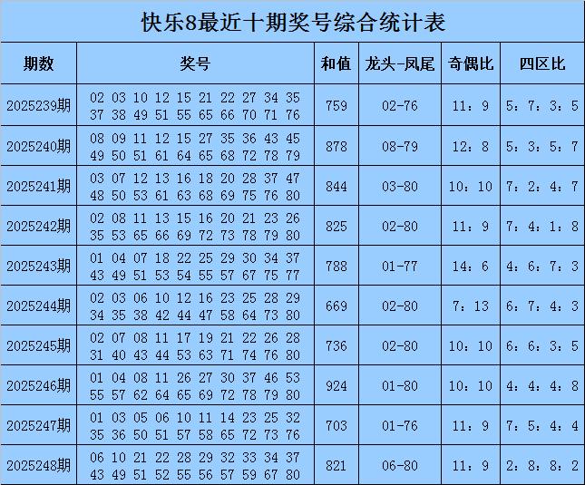 福彩快乐8第2025248期开奖回顾:06 10 21 22 28 29 32 33 34 37 43 49 51 52 55 56 57 59 67 80,其中奖号和值为821,跨度为74,奇偶比开出11:9,012路比开出5:10:5,四区比开出2:8:8:2。