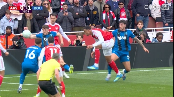 英超官方表示:“阿森纳vs伯恩茅斯第34分钟,裁判判罚手球犯规的决定经过VAR检查并确认——判定克里斯蒂的手臂抬起扩大了身体范围。”