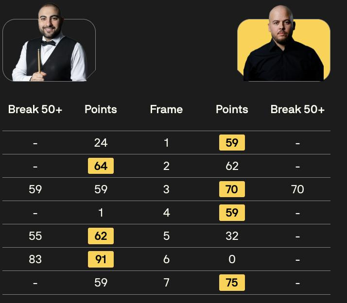 第五局,庞俊旭轰出单杆50分,以89:8赢下该局,大比分3-2率先取得赛点。第六局,丹尼尔·威尔斯抓住机会多次上手得分,以67:20挽救一赛点,双方比赛进入决胜局。第七局,庞俊旭两次上手得分,贡献单杆83分,以114:0拿下该局,大比分4-3惊险晋级。