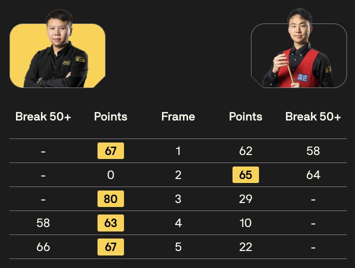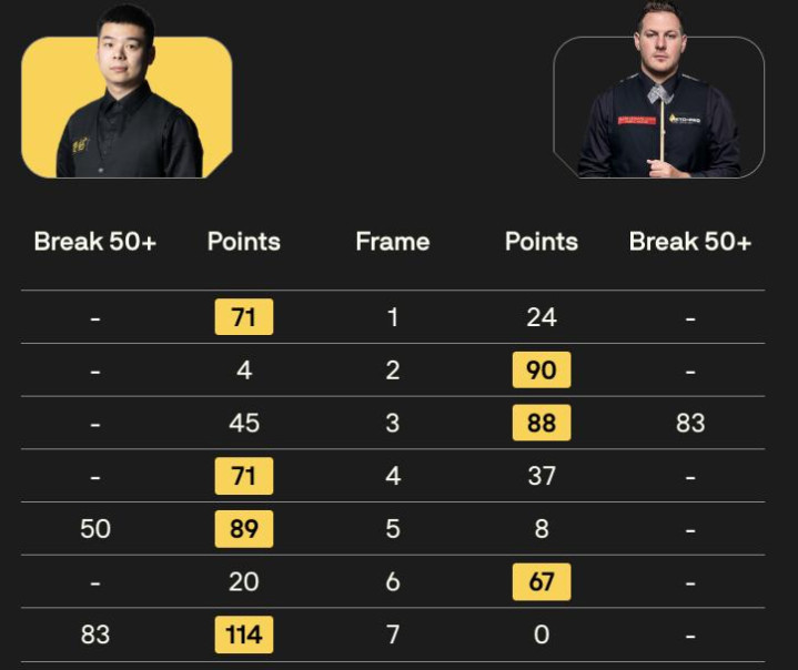 比赛首局,两人进行了长时间缠斗,庞俊旭凭借防守优势,多次获得上手机会,以71:24拔得头筹。第二局,丹尼尔·威尔斯三次上手得分,以90:4扳回一局。第三局,庞俊旭率先上手得45分,之后丹尼尔·威尔斯上手打出单杆83分再下一局,大比分2-1领先。第四局,开局后局面复杂,庞俊旭零敲碎打多次上手得分,以71:37拿下该局,双方比分2-2战平。