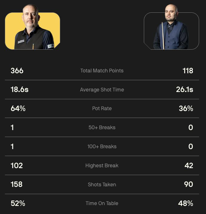 比赛首局,两人手感都不好,互送大礼包,双方交替上手得分,最终马克.威廉姆斯以63:53拔得头筹。第二局,马克.威廉姆斯前后三次上手得分,以68:51再下一局,大比分2-0领先。第三局,马克.威廉姆斯打出单杆74分,以117:0拿下该局,大比分3-0率先取得赛点。第四局,马克.威廉姆斯渐入佳境,轰出单杆破百102分,以118:14赢下该局,大比分4-0横扫晋级32强。