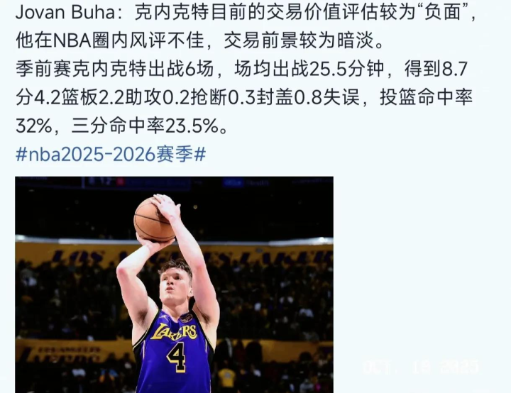 NBA记者jovan buha谈到湖人去年的17顺位新秀克内克特,认为他现在根本没有什么交易价值,而且其他球队对他的评价也不好,如果在新赛季不能调整回来的话,那很有可能是下一个席菲诺!
