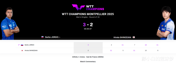 2025年WTT蒙彼利埃冠军赛男单1/8决赛,斯洛文尼亚选手约奇克3-2逆转日本选手篠塚大登,五局比分:2-11,11-5,7-11,12-10,11-6。约奇克晋级8强,篠塚大登止步16强,欧洲两战篠塚大登均止步16强。