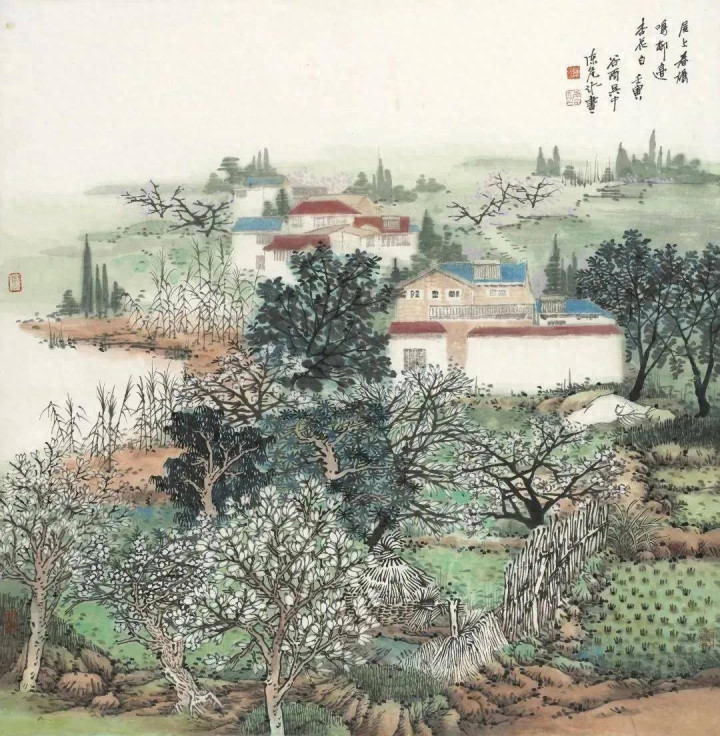 毫无疑问,陈危冰笔下的这些典型场景,集中表达了一个艺术家对今天这个时代的感受和判断。从学术传统看,中国古代田园山水画的审美趣味是属于文人士大夫的,以一种带有疏离意味的笔触,把田园山水拉远了看,讲究的是一种文人雅趣,甚至要刻意营造一种萧疏的气韵。而且,以前历代画家的田园山水,主要注意力都在山林之中,田园属于配景,而非主题性创作。而陈危冰跟这种意趣正相反,他要的是贴近,他的态度是拥抱,他追求的是真正的田园主题,他的色彩是温暖的,他的呼吸里有着普罗大众的味道,他描绘的是真实的生活。从艺术创作的角度看,这是一种危险的行为,因为,弄不好就“俗”。造型俗,角度俗,色彩俗,构图俗,每一个俗字都能让一张作品成为“鬼画”而不是“绘画”。但陈危冰不怕这个,他的笔调足够灵动,他的色彩足够透亮,他的图式足够鲜活,他的角度足够大气。尤其可贵的是他的大胆,那些现代化的建筑,粉墙红瓦的楼房,甚至一个具有代表性的工业符号——电线杆,在他的作品里都被安排得妥妥帖帖,绝不会让你觉得突兀、有碍观瞻,这就是他的本事。他的笔下,是典型的江南田园“现在进行时”。什么叫“笔墨当随时代”?取材当代,以家乡江南风物入画,敢于和善于发现当下之美,在传统中国笔墨中揉进工业文明要素而能和谐生趣,这种独特的美学追求,找遍中国,陈危冰独此一家。