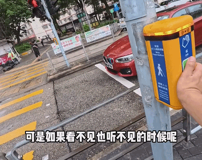 等待红绿灯时,听着电子行人过路发声装置,通过声音和触觉信号,在触摸和按下按钮后,会有震动的提示,方便视障人士更安全过马路;